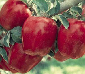 Fructe: mari (180–220 g), rotunde, de un roșu intens uniform, cu pulpa alb-gălbuie, crocantă, suculentă și aromată.